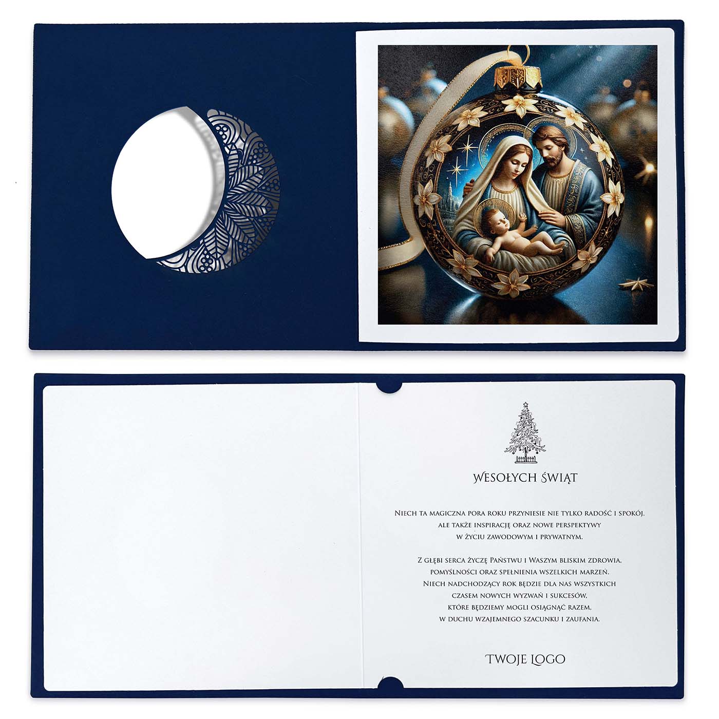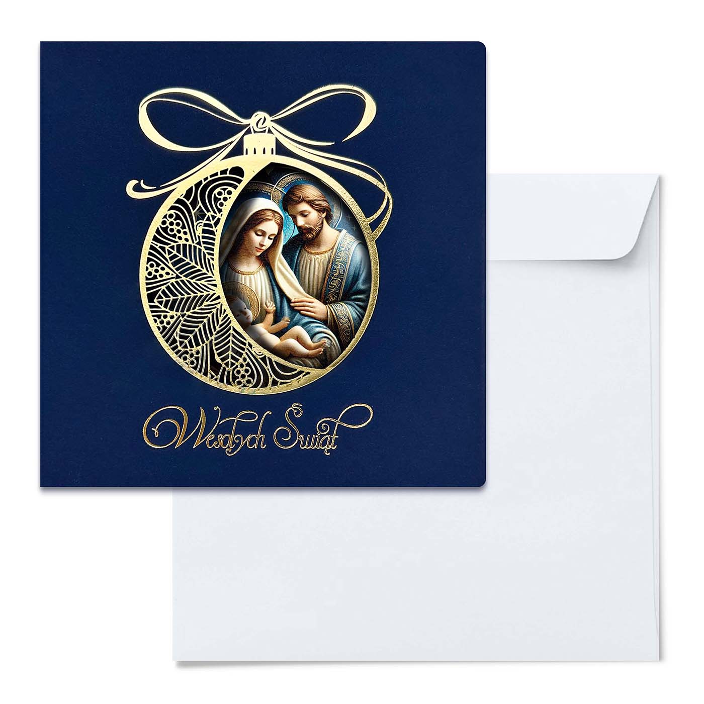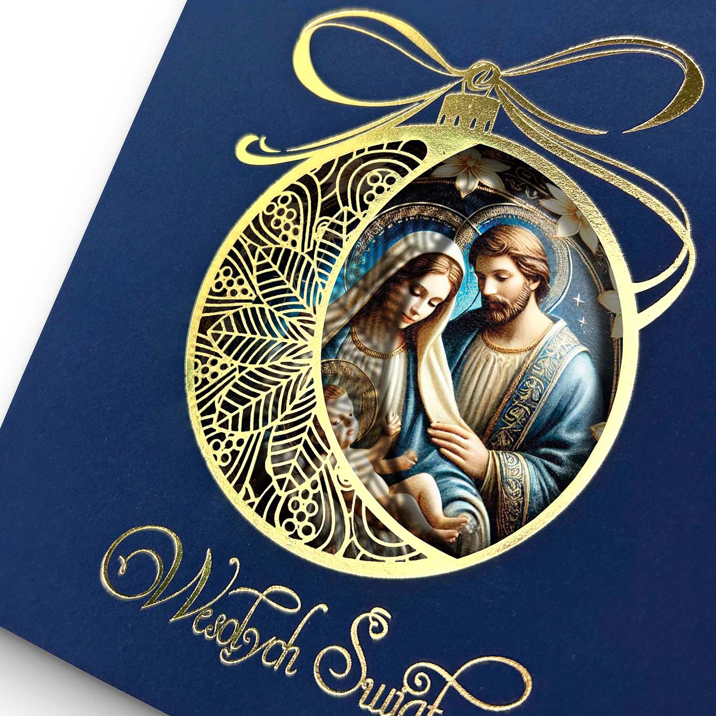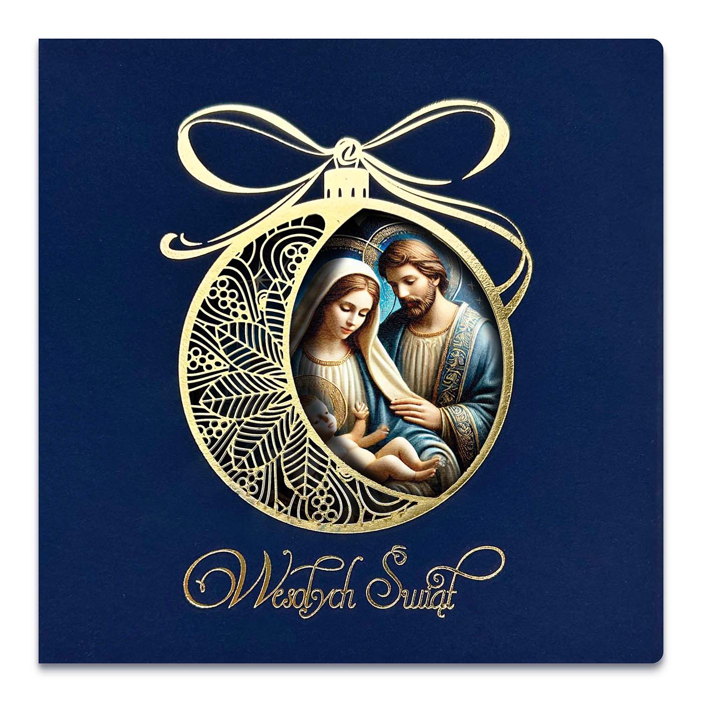 Kartka świąteczna Święta Rodzina w ażurowej bombce
