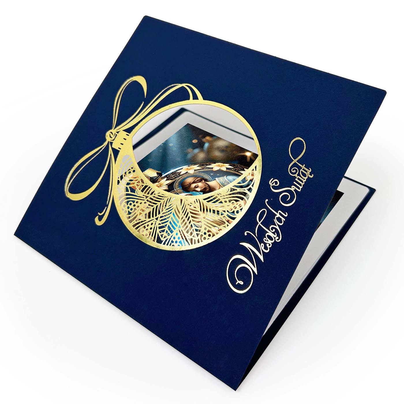 Elegancka kartka świąteczna inspirowana klasyczną ikonografią Bożego Narodzenia, wykonana z wysokiej jakości papieru barwionego w masie w odcieniu głębokiego granatu. Okładkę zdobi przestrzenna aplikacja w formie złotej bombki - wykonana z użyciem precyzyjnego laserowego cięcia i hotstampingu na złoto.