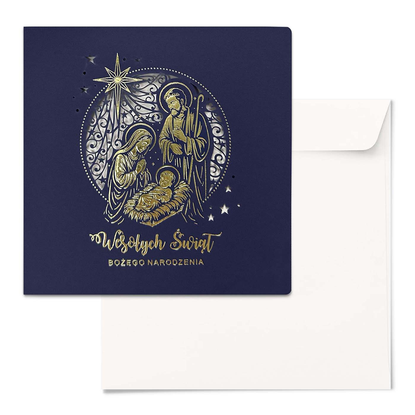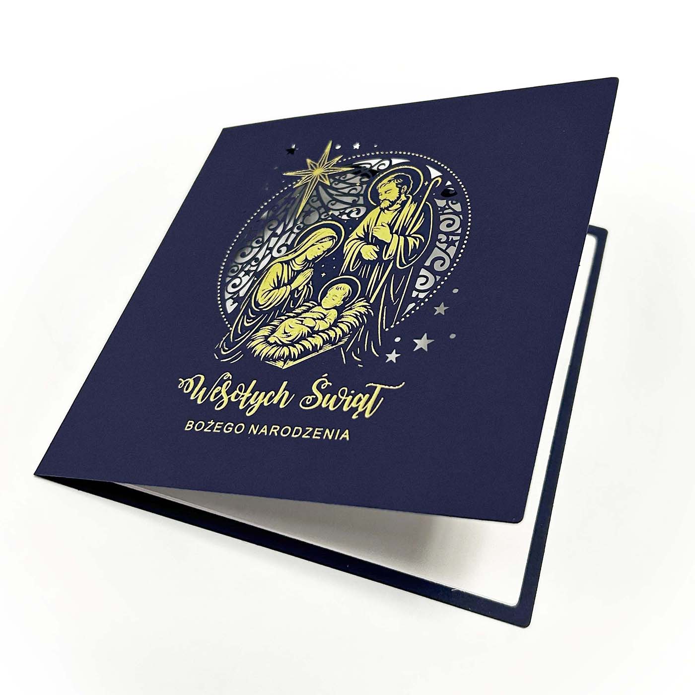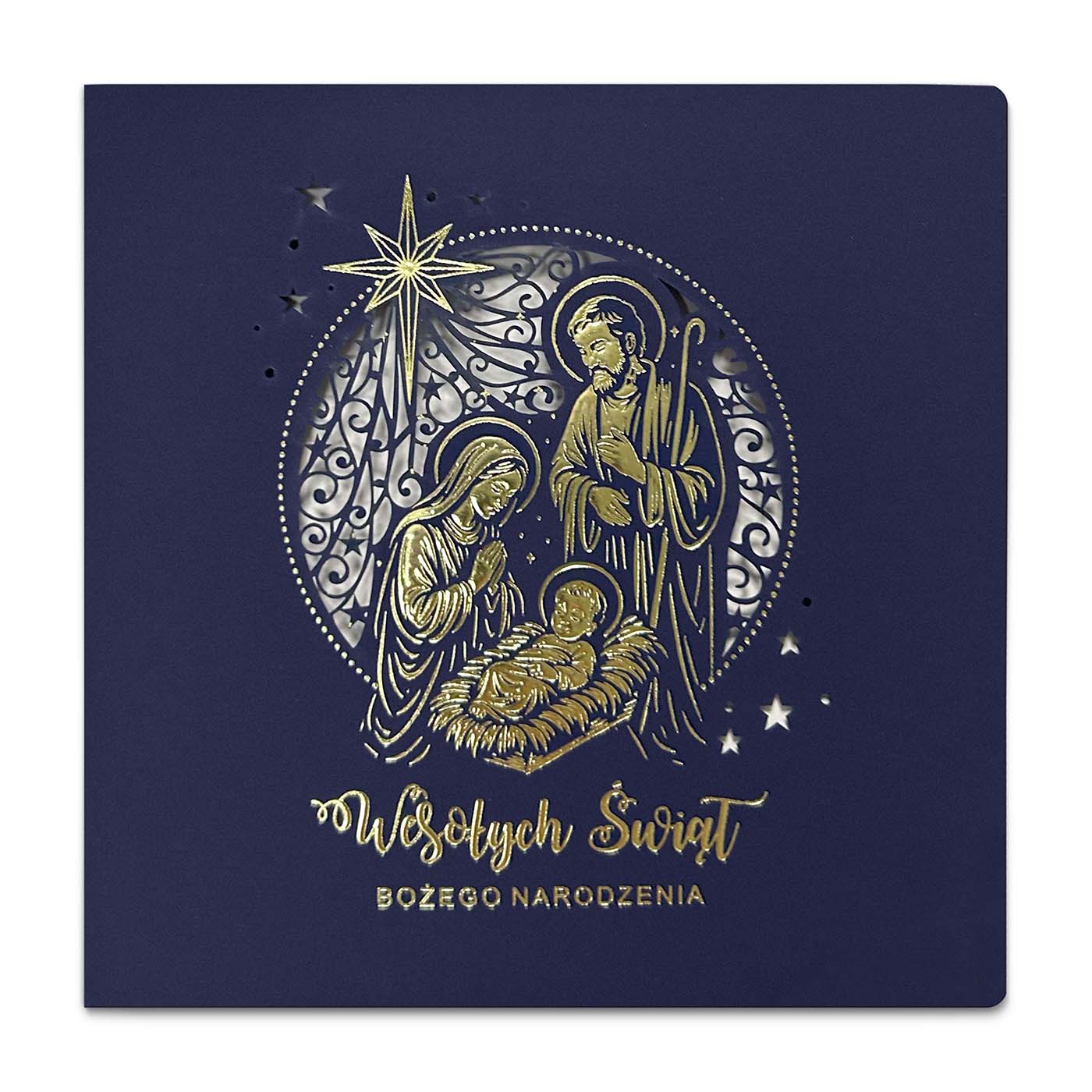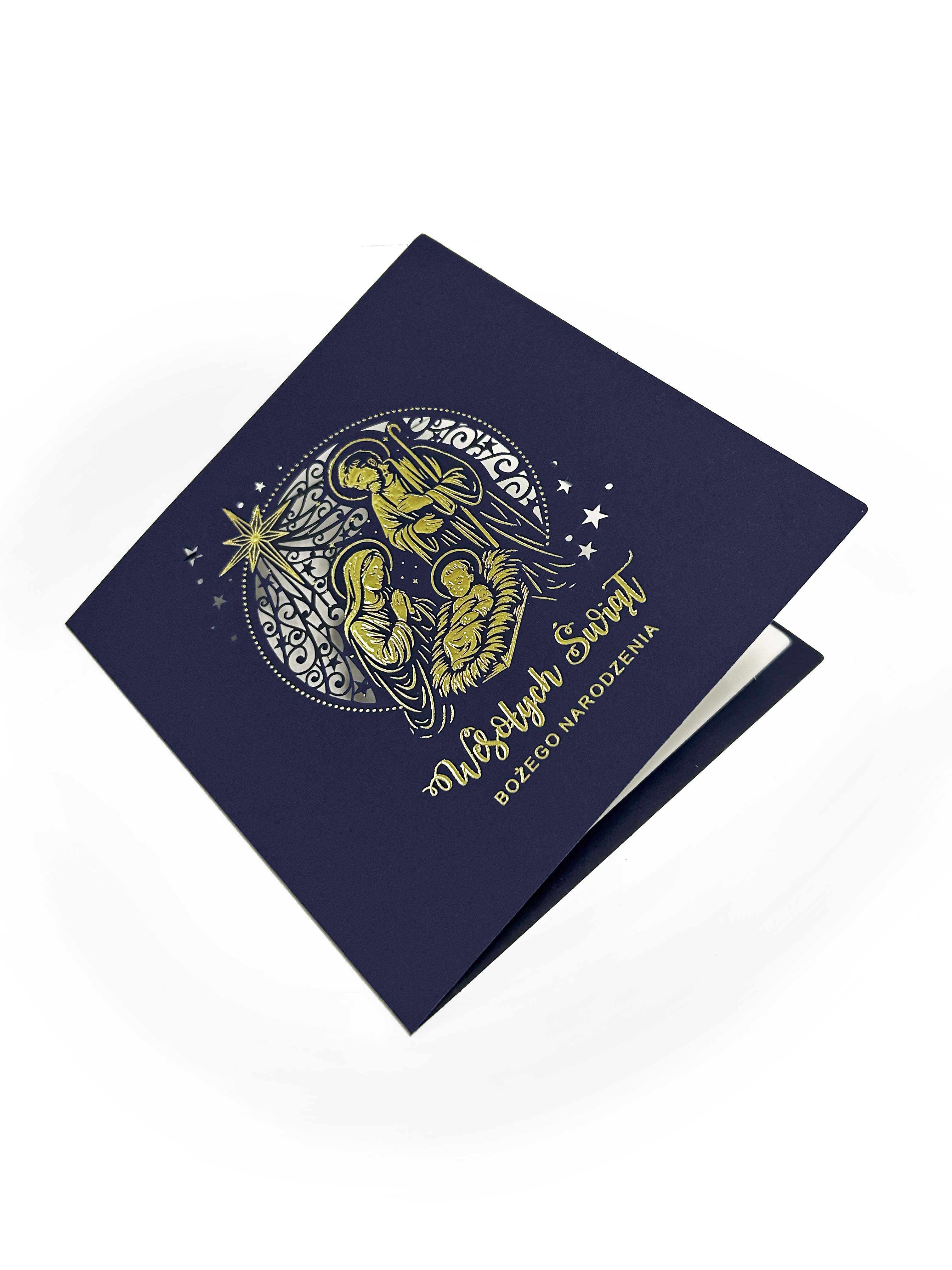 Ekskluzywna kartka świąteczna zaprojektowana z myślą o firmach i osobach ceniących tradycję, symbolikę oraz najwyższą jakość detalu. Okładkę wykonano z papieru barwionego w masie w głębokim, granatowym kolorze, który nadaje całości szlachetnego charakteru. Centralnym motywem jest przedstawienie Świętej Rodziny, ozdobione efektownym złoceniem oraz precyzyjnie wykonanym, ażurowym tłem w formie okręgu.