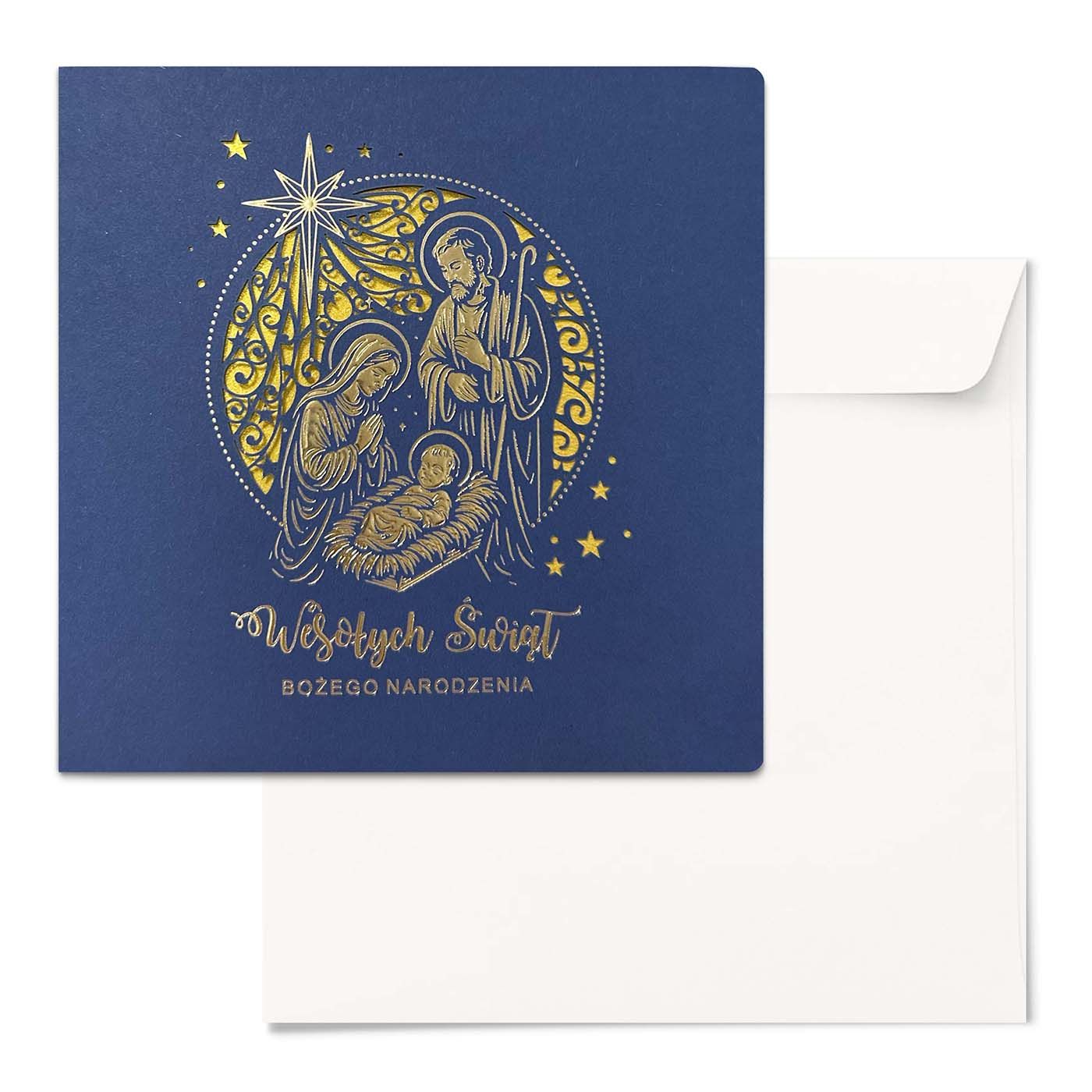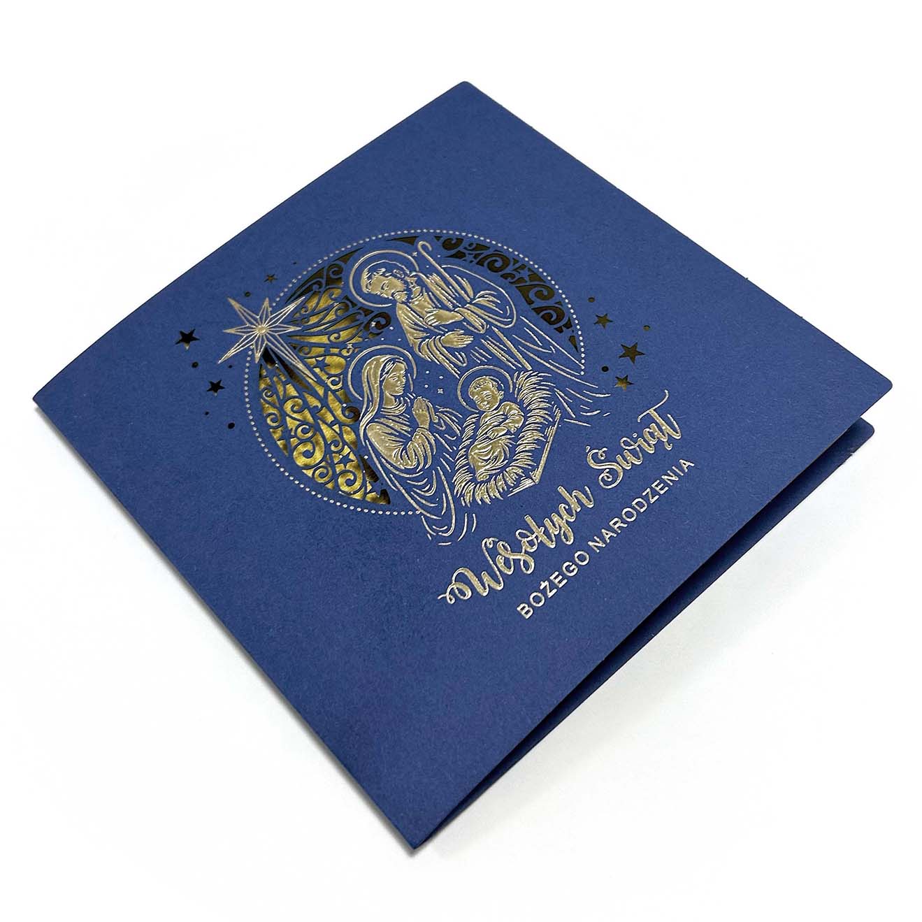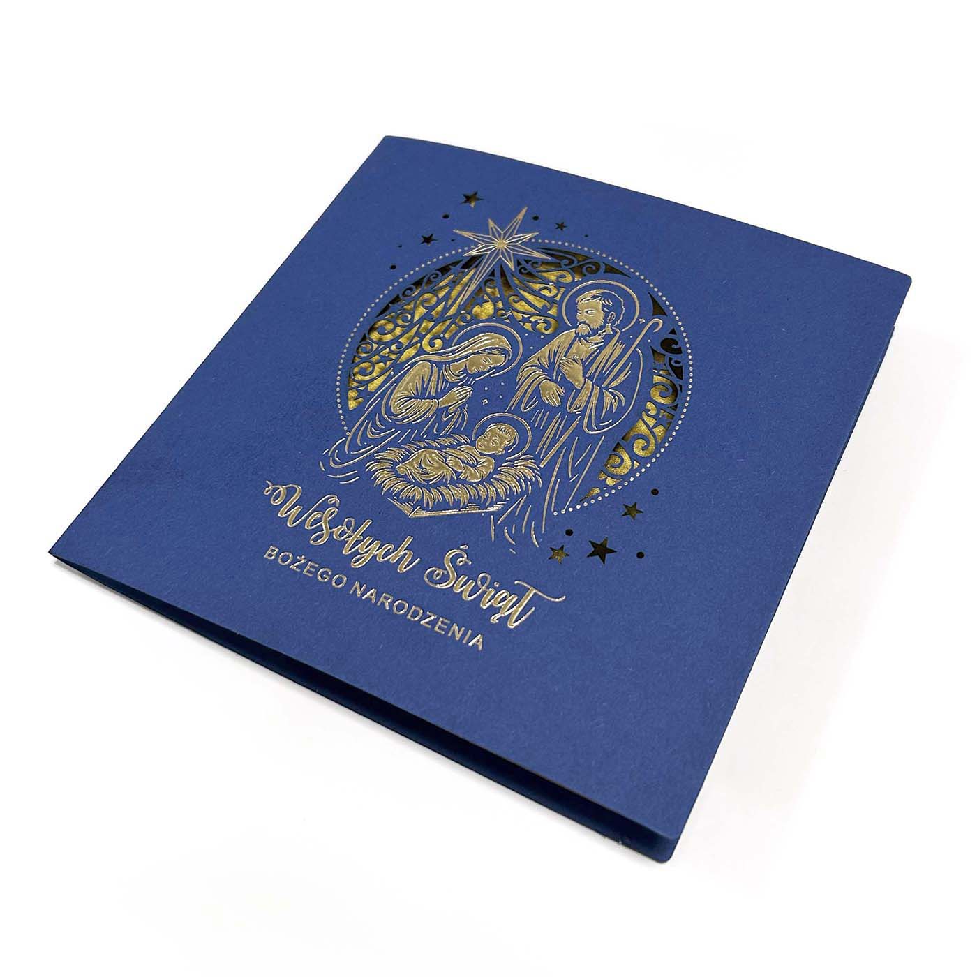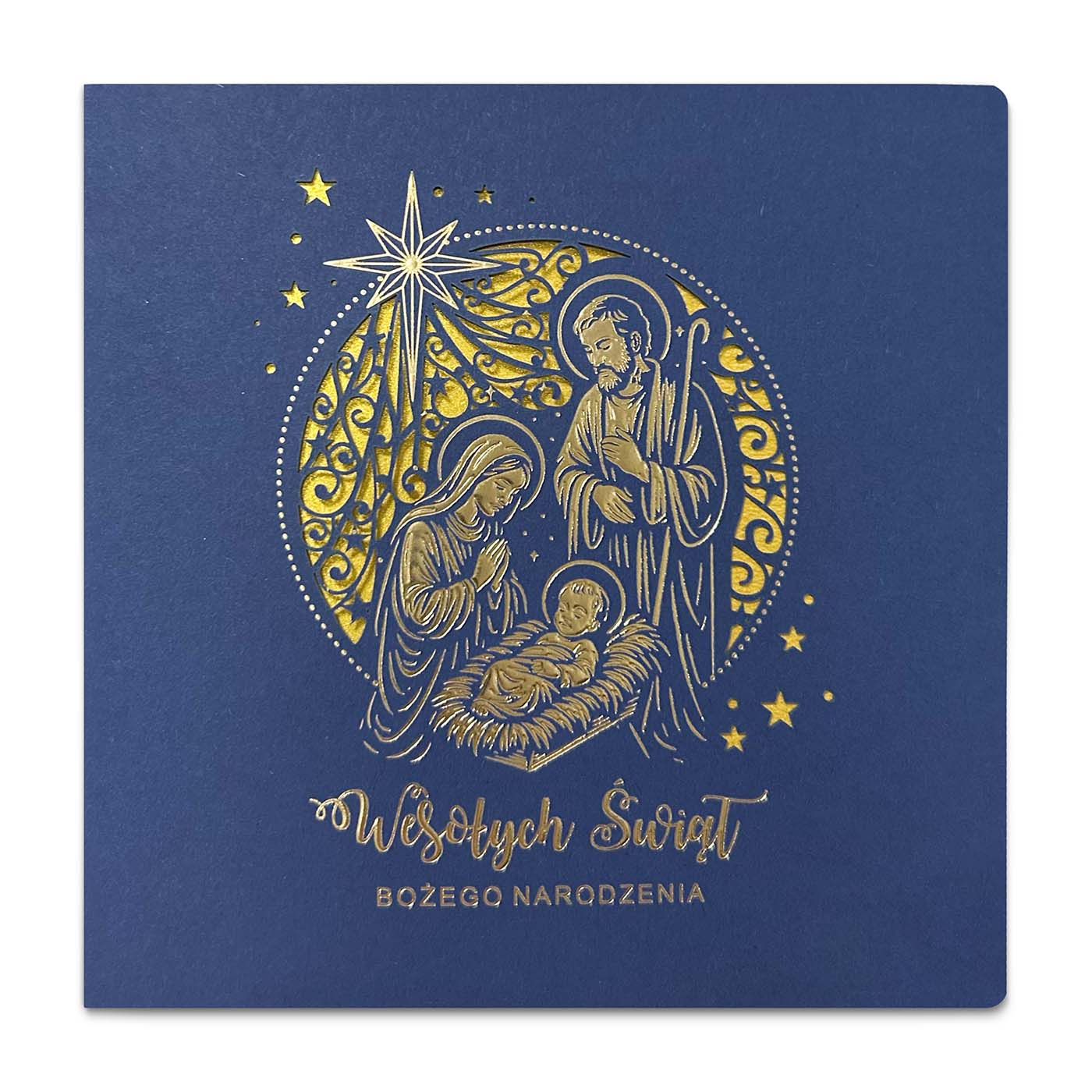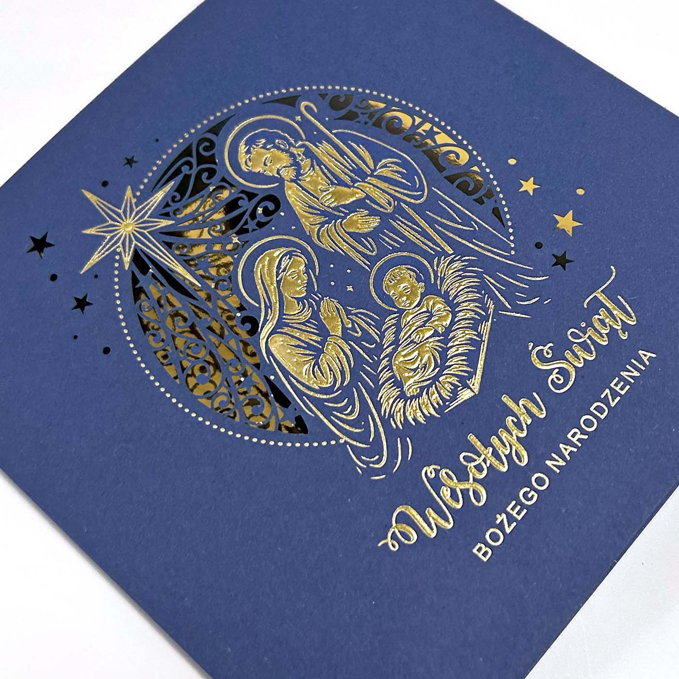 Ekskluzywna kartka świąteczna zaprojektowana z myślą o firmach i osobach ceniących tradycję, symbolikę oraz najwyższą jakość detalu. Okładkę wykonano z papieru barwionego w masie w intensywnym, granatowym kolorze, który nadaje całości szlachetnego charakteru. Centralnym motywem jest przedstawienie Świętej Rodziny, ozdobione efektownym złoceniem oraz precyzyjnie wykonanym, ażurowym tłem w formie okręgu.