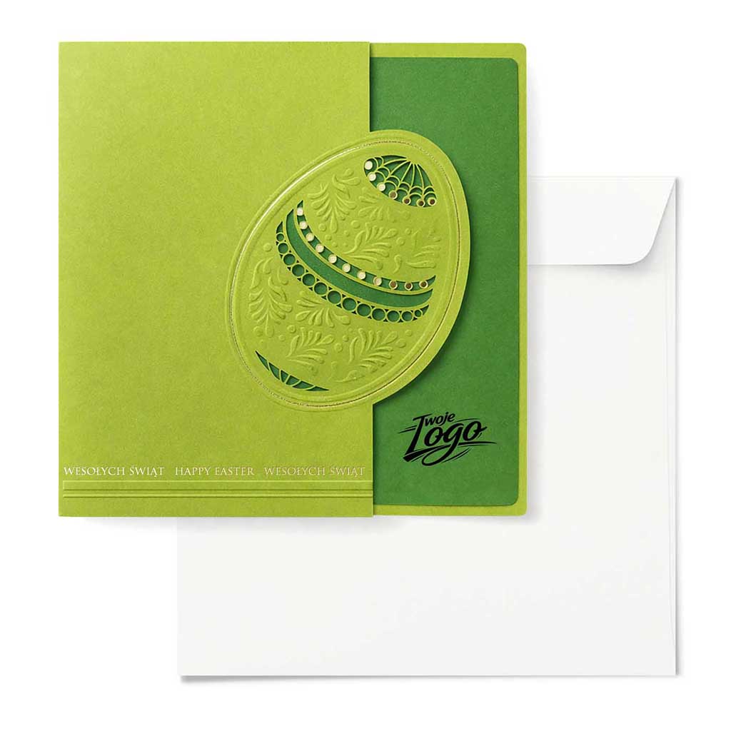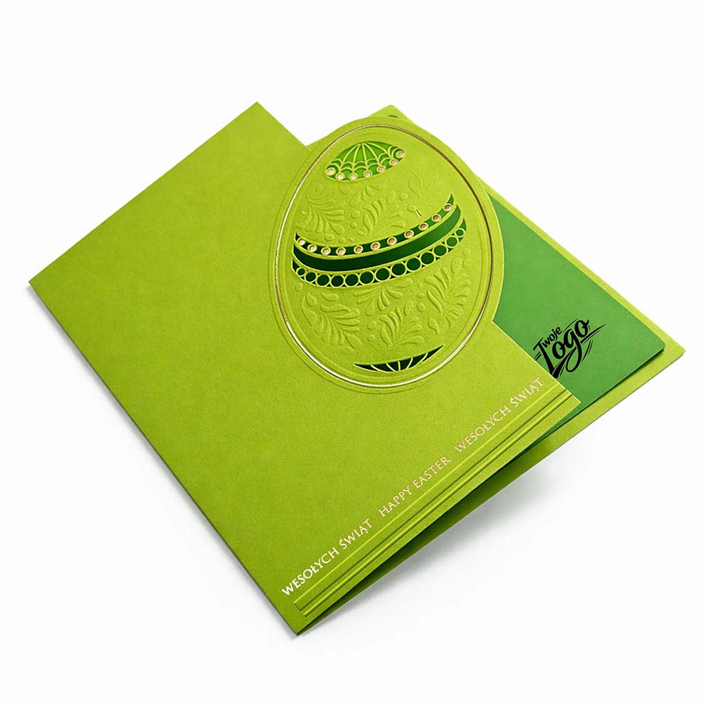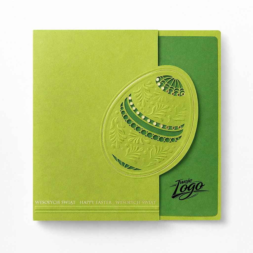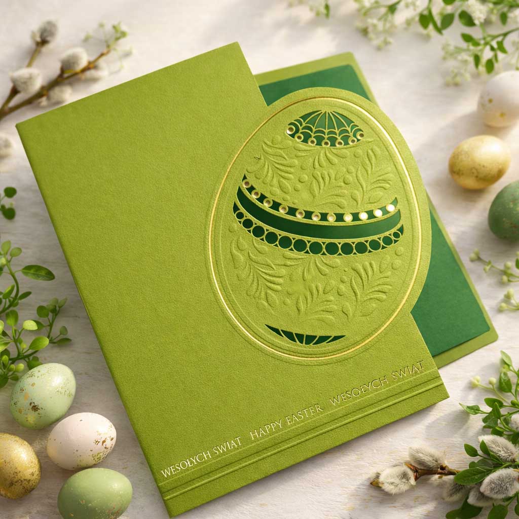 Ekskluzywna kartka wielkanocna o nowoczesnym, biznesowym charakterze, zaprojektowana z myślą o firmach, które cenią wyrafinowaną prostotę i spójność wizualną. Intensywna, świeża zieleń oraz gra kilku odcieni barwionych w masie papierów tworzą efekt głębi i eleganckiej, wiosennej energii - bez zbędnej dekoracyjności, za to z klasą.