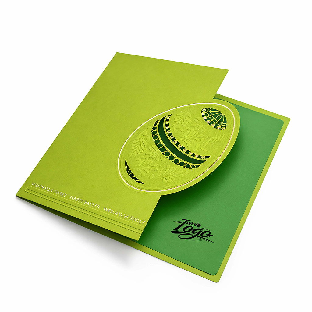 Wnętrze kartki utrzymane jest w spójnej, zielonej kolorystyce - zastosowano papier barwiony w masie w głębszym odcieniu zieleni, co zapewnia elegancki kontrast oraz doskonałą bazę pod nadruk indywidualnych życzeń i logotypu. Całość tworzy przemyślaną, konsekwentną wizualnie formę, która podkreśla profesjonalny charakter relacji biznesowych.