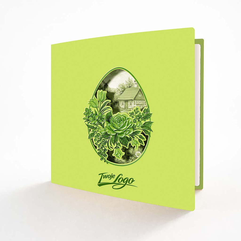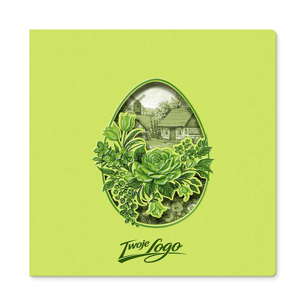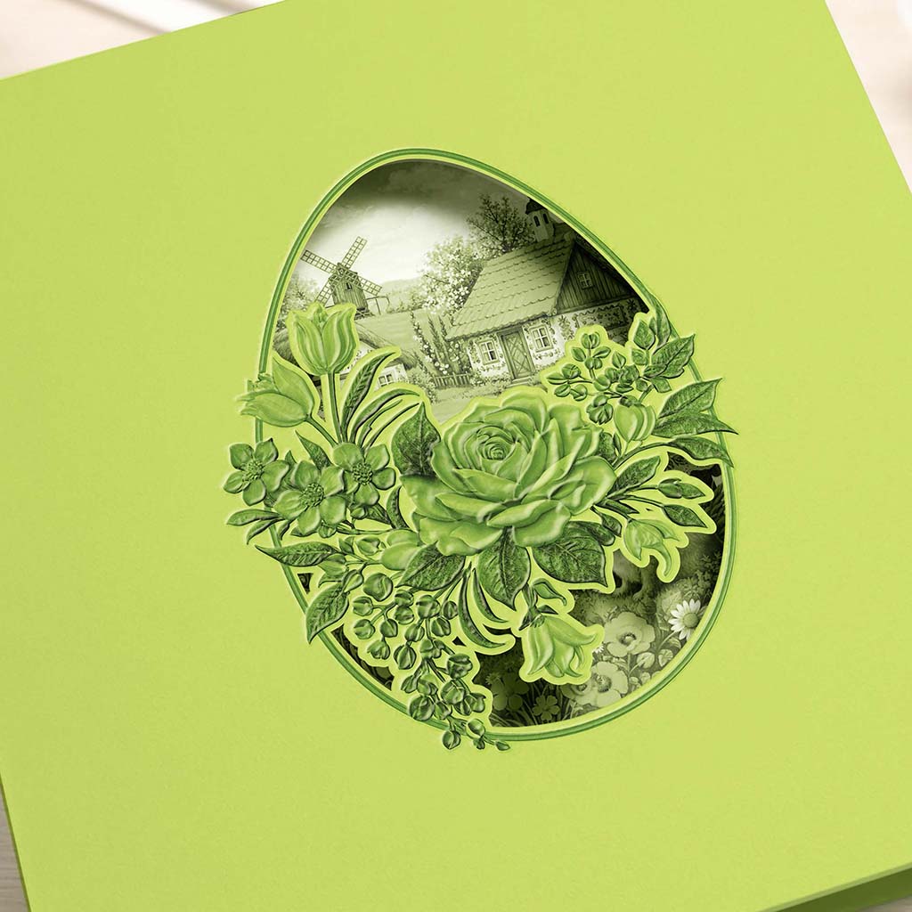 Okładka wykonana została z wysokiej jakości papieru w odcieniu świeżej zieleni, który nadaje całości lekkości i naturalnego charakteru. Centralnym elementem jest precyzyjnie wycięta laserowo forma pisanki, odsłaniająca ilustrację przedstawiającą sielski krajobraz - wiejski domek, wiatrak oraz delikatną roślinność w tle.
