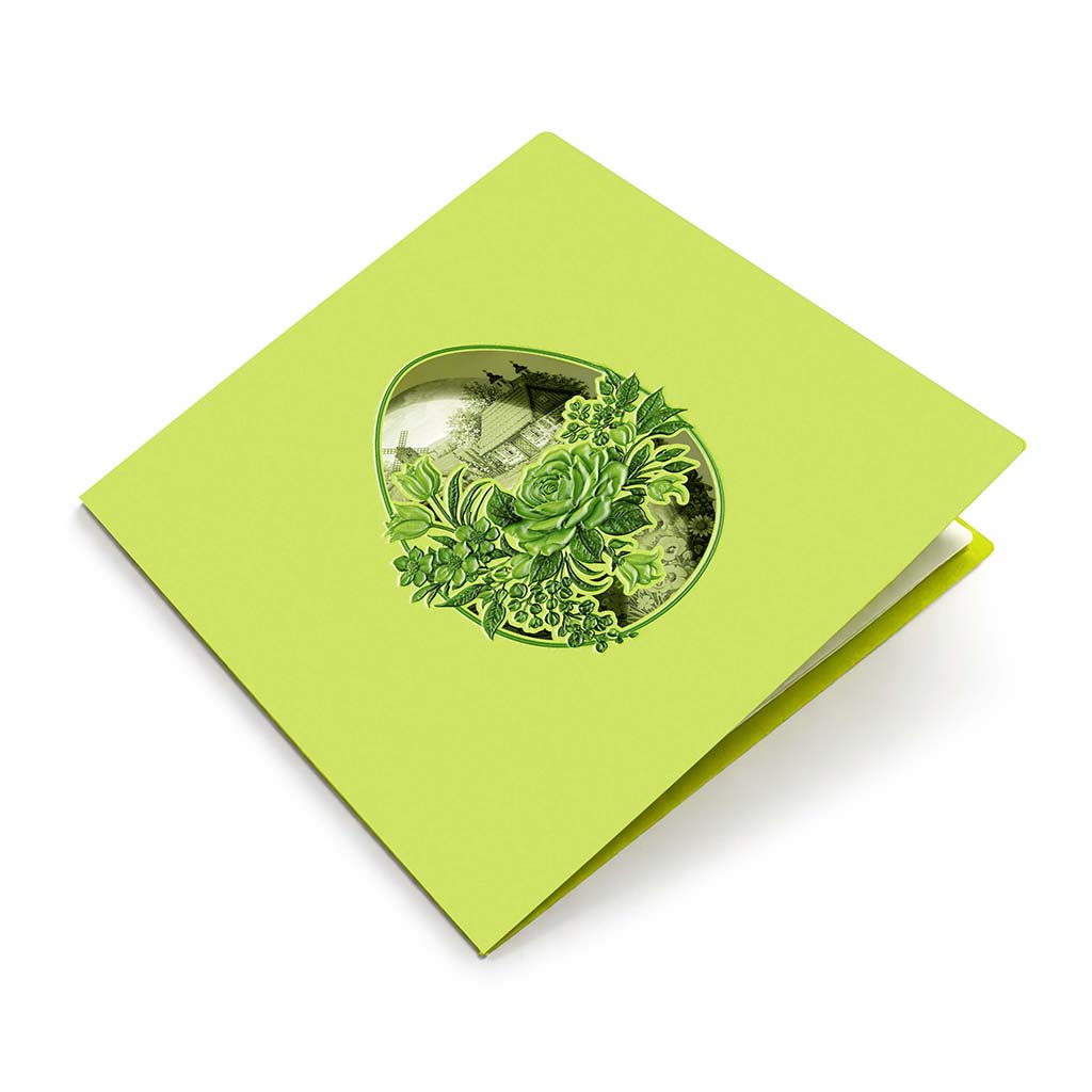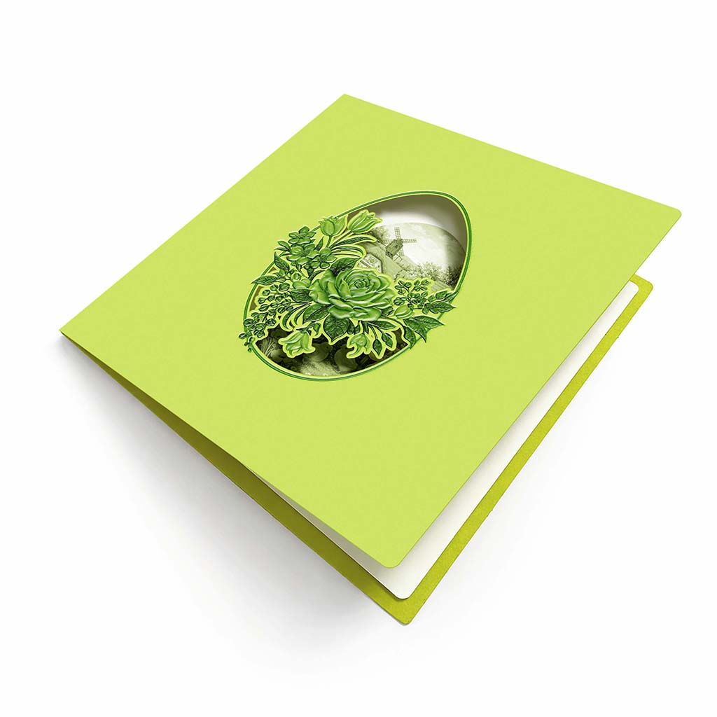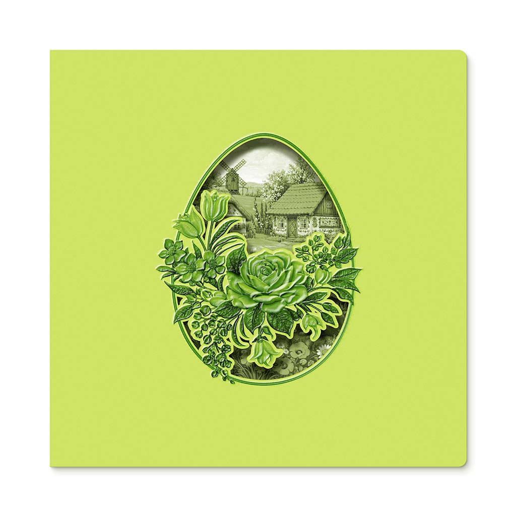 Okładka wykonana została z wysokiej jakości papieru w odcieniu świeżej zieleni, który nadaje całości lekkości i naturalnego charakteru. Centralnym elementem jest precyzyjnie wycięta laserowo forma pisanki, odsłaniająca ilustrację przedstawiającą sielski krajobraz - wiejski domek, wiatrak oraz delikatną roślinność w tle.