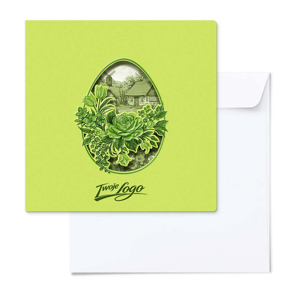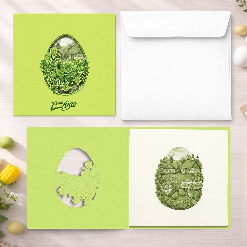 Wyjątkowa kartka wielkanocna z limitowanej serii, utrzymana w świeżej, wiosennej kolorystyce, zaprojektowana dla marek i osób, które cenią dopracowaną formę oraz estetykę inspirowaną naturą. Projekt łączy klasyczny motyw pisanki z nowoczesnym podejściem do kompozycji i subtelnym efektem przestrzenności.