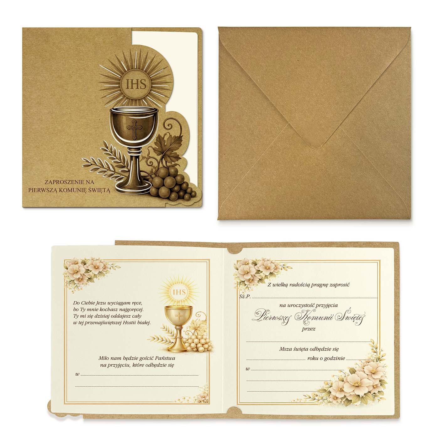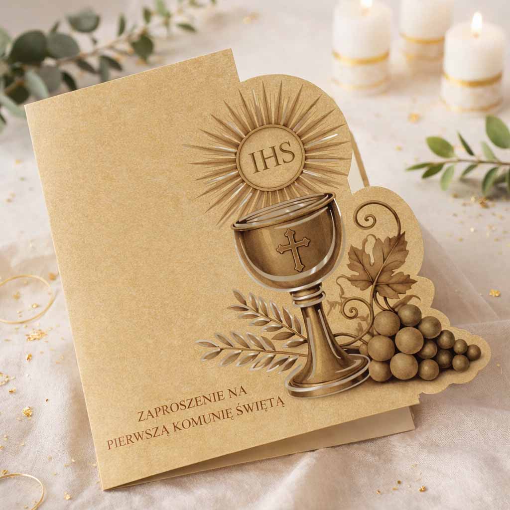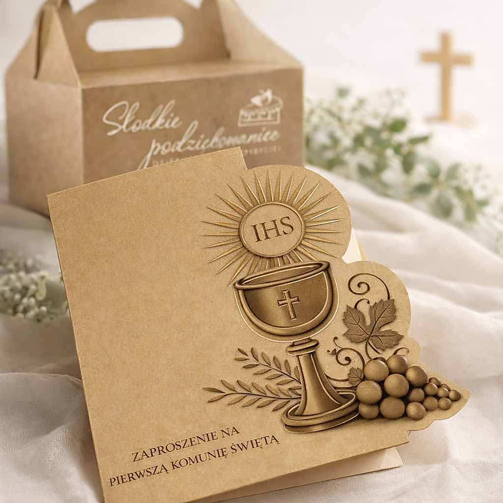 Starannie zaprojektowane zaproszenie komunijne, które łączy klasyczną estetykę z urokiem ekologicznych materiałów. Całość utrzymana jest w spokojnej, harmonijnej stylistyce, idealnie podkreślającej wyjątkowy charakter uroczystości.