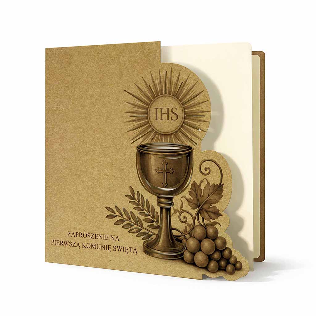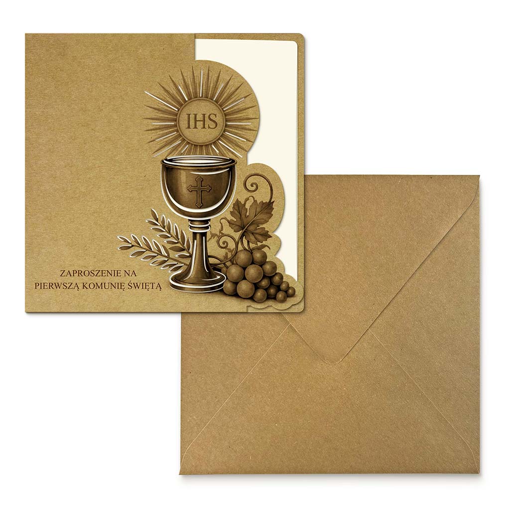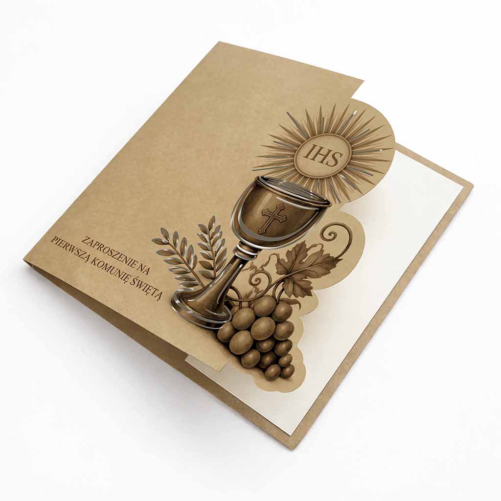 Głównym motywem dekoracyjnym jest symbolika eucharystyczna - kielich, hostia z monogramem IHS oraz elementy winorośli. Kompozycja utrzymana w jednolitej, stonowanej kolorystyce brązów nadaje zaproszeniu elegancji i ponadczasowego wyrazu.