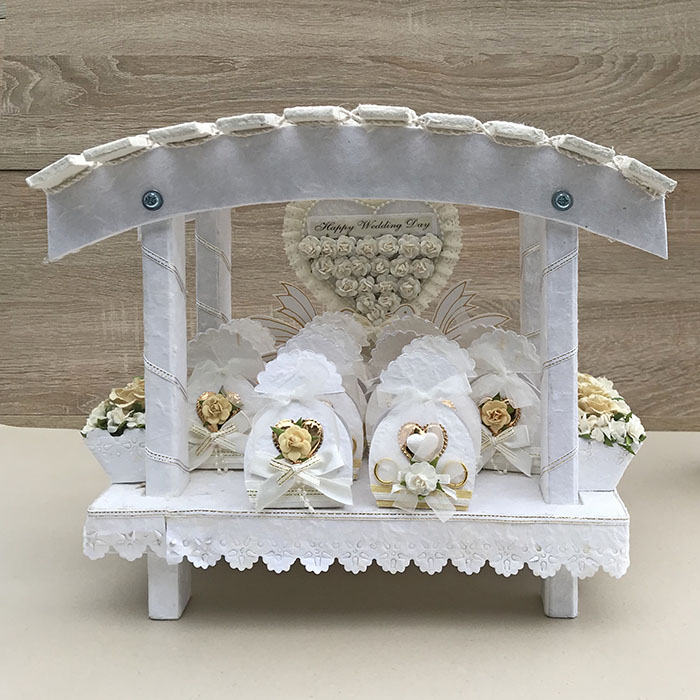Wyjątkowa dekoracja ślubna w formie stylowego stelażu, wypełniona ręcznie wykonanymi pudełeczkami z wysokiej jakości papieru czerpanego. Każde pudełeczko ozdobione jest wtapianymi kwiatami, subtelnymi wstążkami i eleganckimi detalami, dzięki czemu stanowi piękną formę podziękowania dla gości.