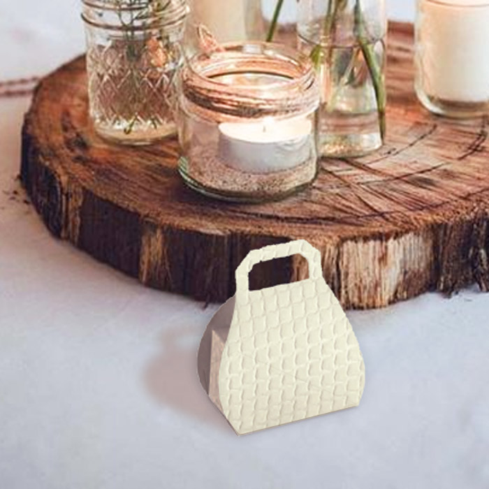 Stylowe pudełeczko wykonane z fakturowanego, sztywnego papieru w kolorze ecru. Subtelna forma przypominająca torebkę sprawia, że idealnie nadaje się na drobne upominki dla gości weselnych, komunijnych czy uczestników innych wyjątkowych uroczystości.