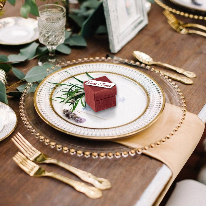 Wyjątkowe pudełeczko wykonane z eleganckiego, fakturowanego papieru w kolorze głębokiego bordo. Sztywna konstrukcja i klasyczna forma nadają mu stylowego charakteru, który doskonale wpisuje się w rustykalny, ale i elegancki wystrój przyjęcia.